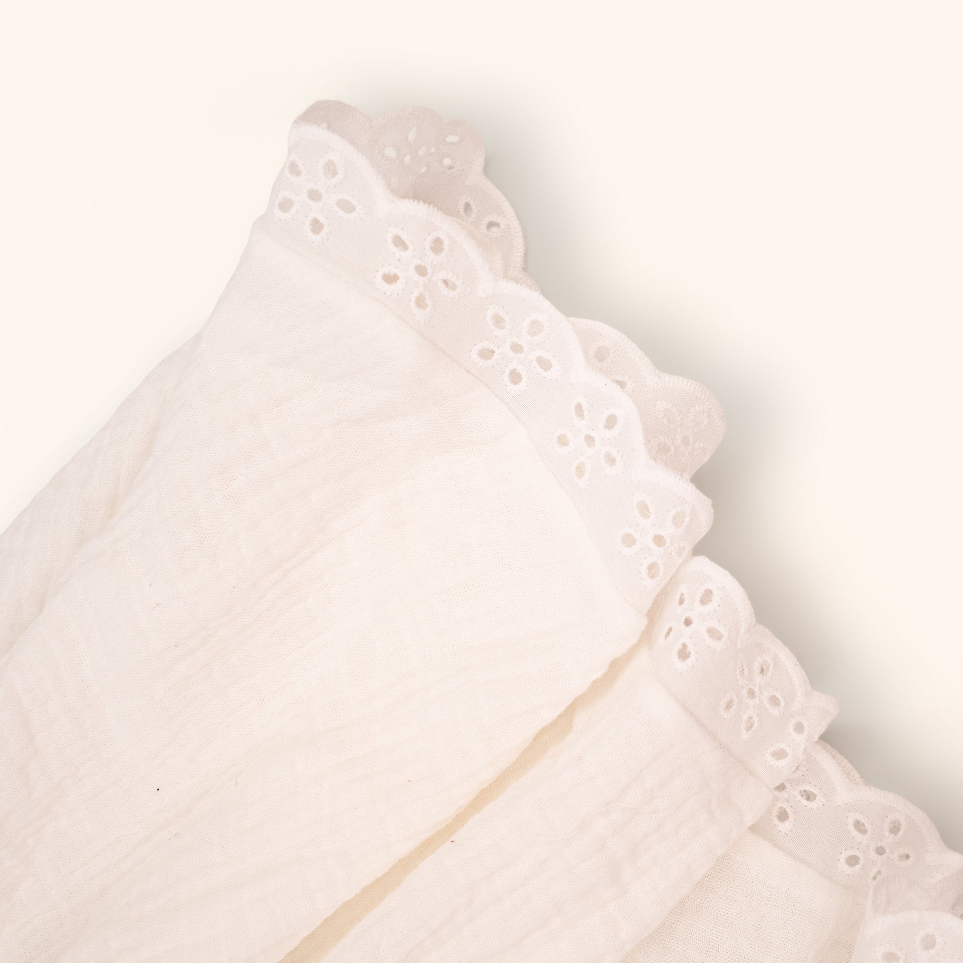 In our classic warm summer white with beautiful broderie anglaise scallop trim, this colorway works well with our Gardenia swim stories in UPF50+ and OEKO TEX 100 Standard fabrications.